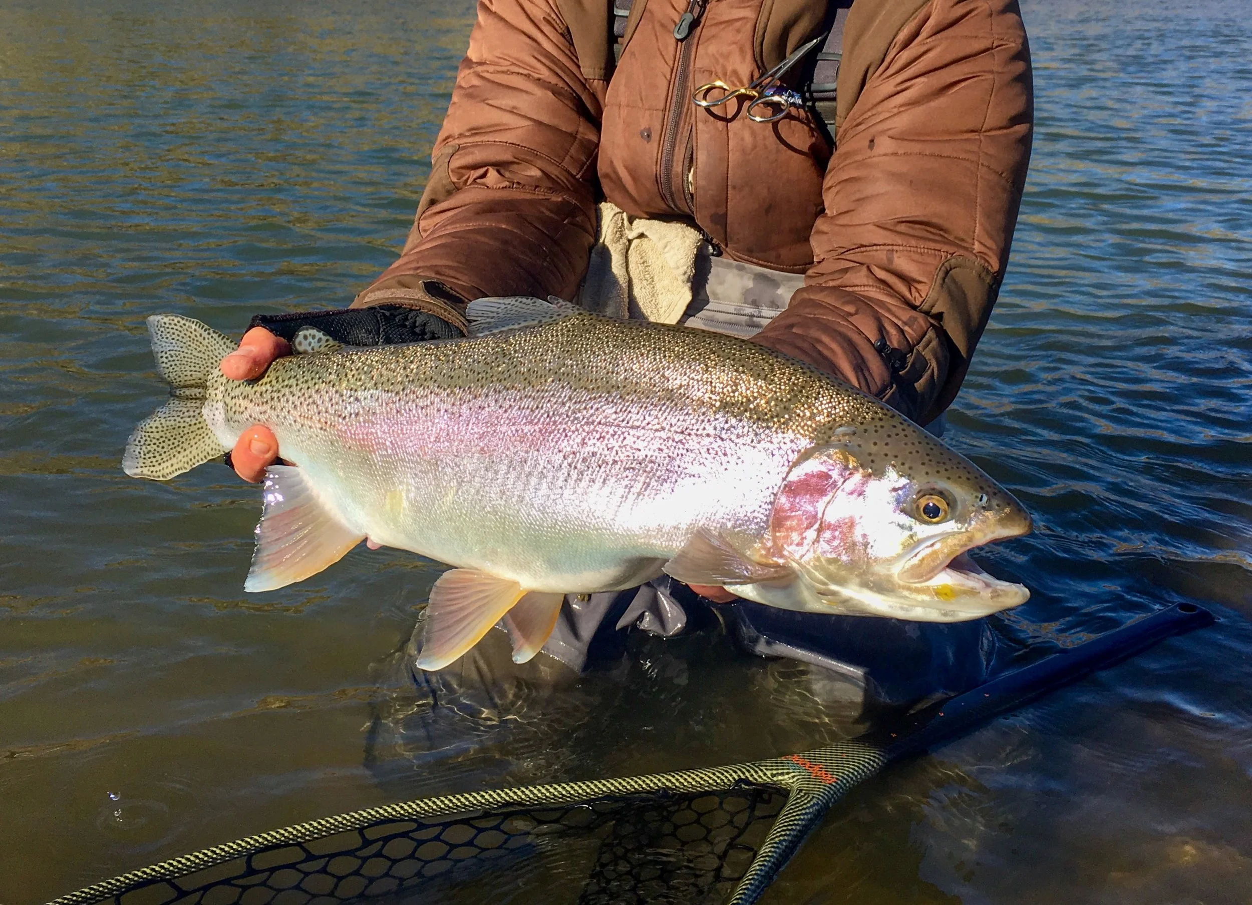 Timing and temperature are our two significant factors. Since winter mornings can be pretty brisk, I don’t recommend wetting a line before 10am, allowing the ambient air temperature to warm up, which will reflect in the water warming up and bug life to emerge. I recommend you fish till 5:30-6:00pm; this will allow you to fish through the warmer water temperatures and a shift to low light. You will most likely see the bigger fish of the day in the 3pm-dark time window. This also allows you to witness one of our winter sunsets from the river, which can be breathtaking.